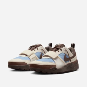 De eerste Zoom Field Jaxx releasde in januari, in de ‘Chocolate’ colorway: met wit, bruin en beige. Het model is een soort mix tussen de Nike Land Shark en Zoom Spiridon, en wordt daardoor ook vaak de ‘Sharkidon’ genoemd. De vernieuwde kleurvariant is ‘Leche Blue’ en is een verfrissende upgrade door de lichtblauwe suède details. Ook niet te missen is het smiley-logo op de achterkant van de sneaker, een verwijzing naar Travis’ merk Cactus Jack.